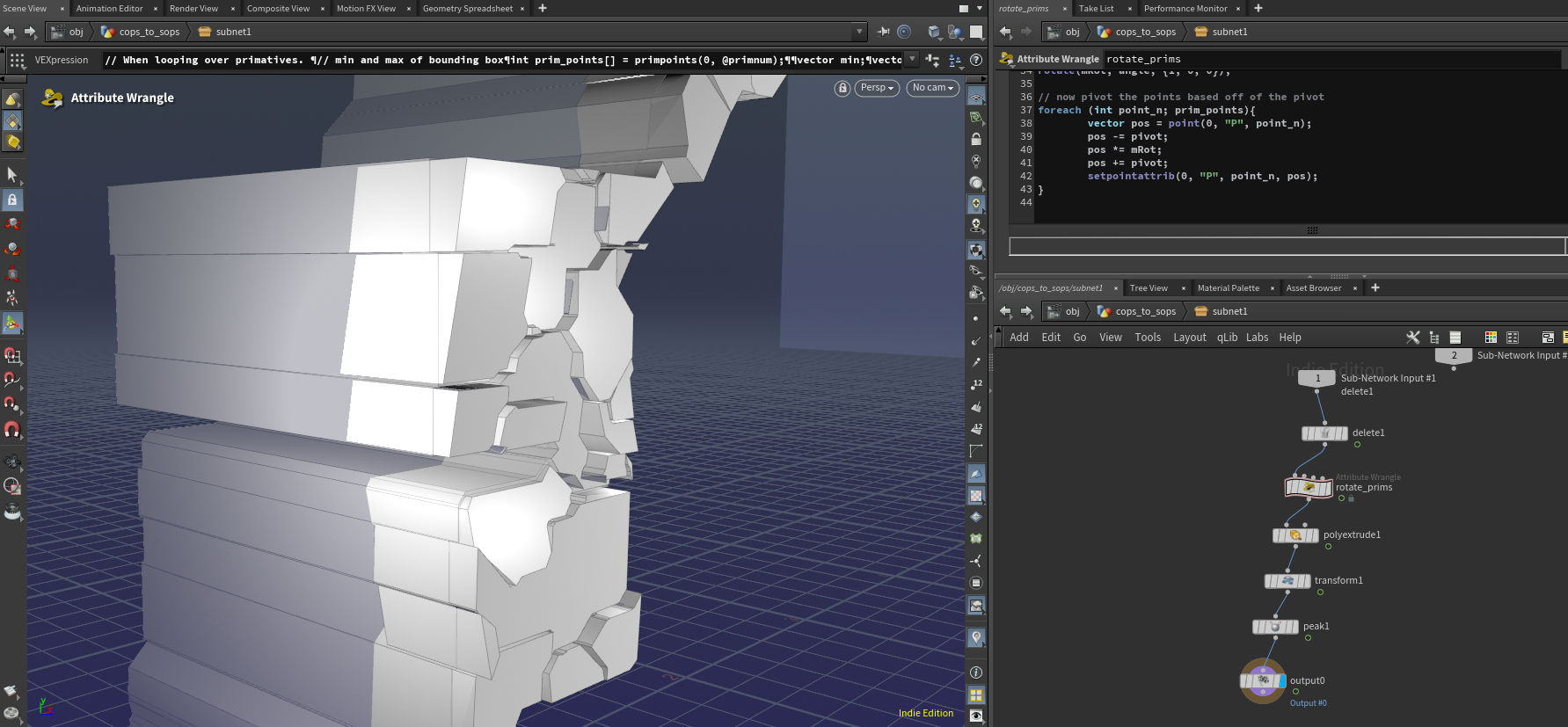 I attempted to take the procedural face details to the next level by also adjusting the tilt of each face. This occurred by rotating each face by either the top or bottom of the face then extruding the face back.